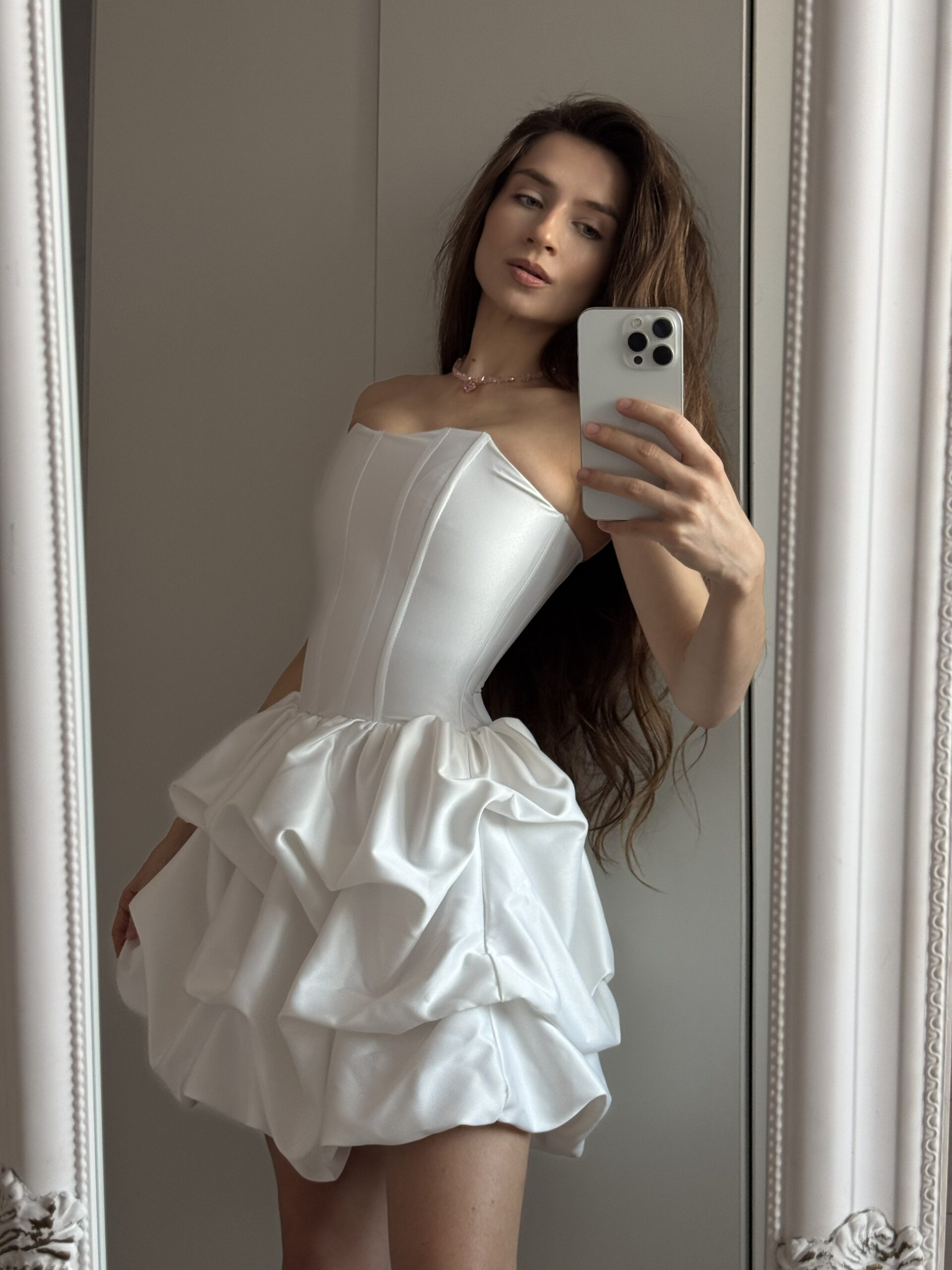 Відчуйте себе королевою у розкішній корсетній сукні “Amour”! Ця модель виконана з якісного атласу, що дарує ніжний блиск і м’якість на дотик. Жіночний корсетний верх із чіткими лініями чудово підкреслює талію, створюючи витончений силует. Об’ємна спідниця із драпіруванням додає грайливості та шарму.