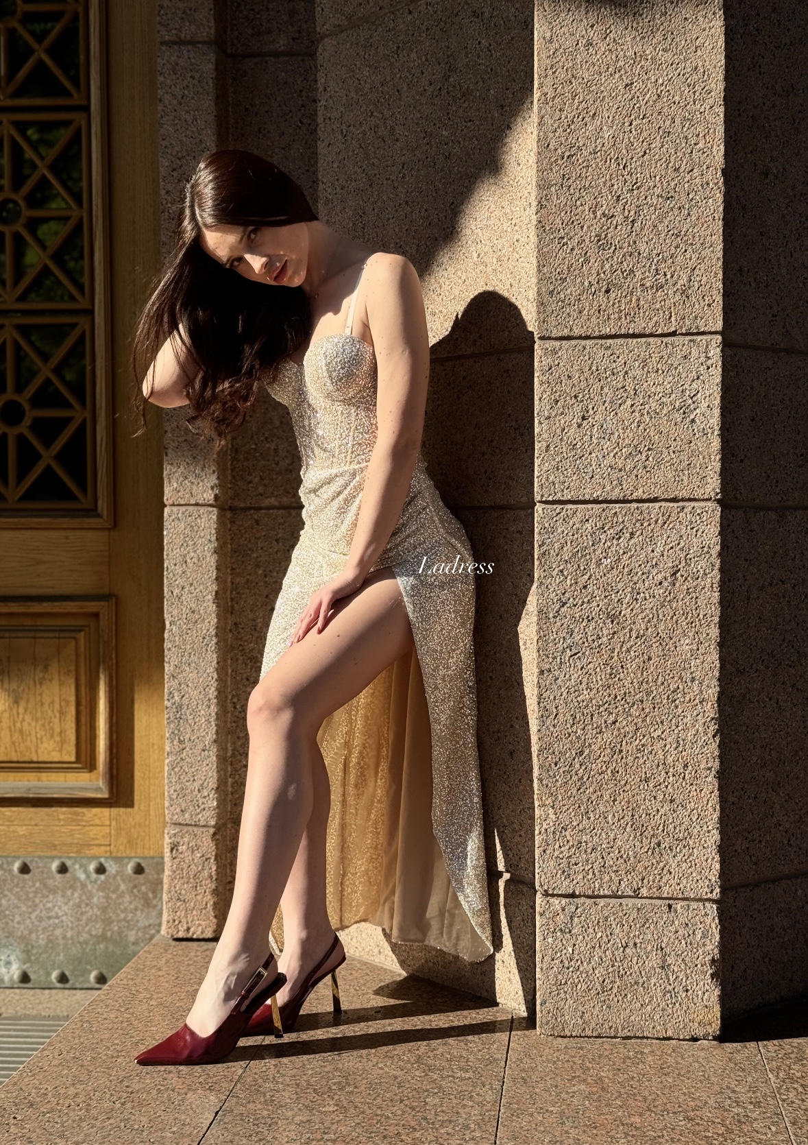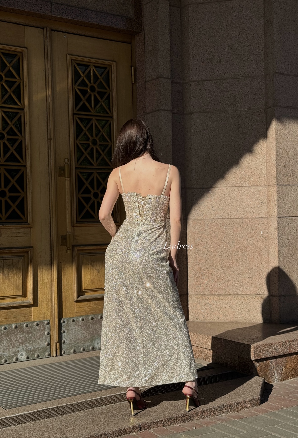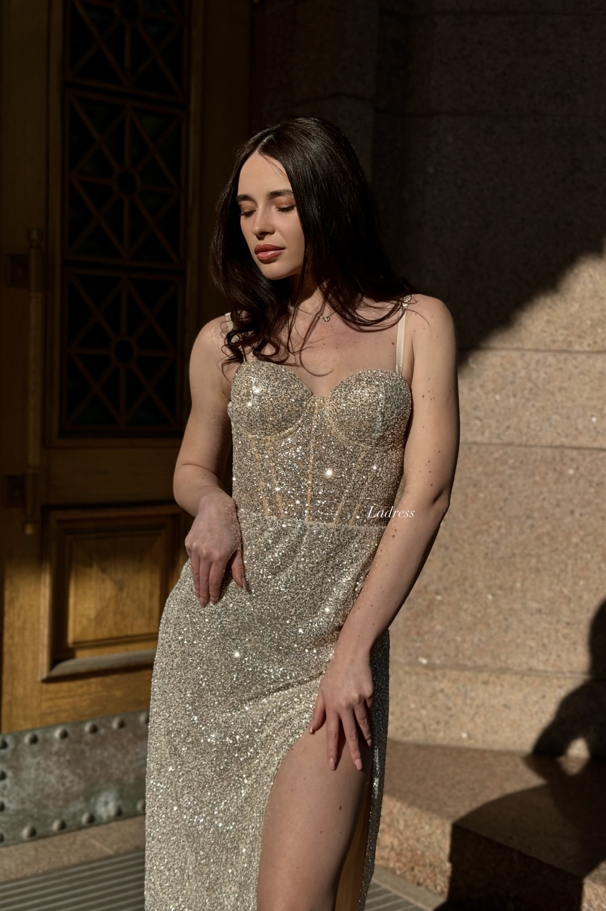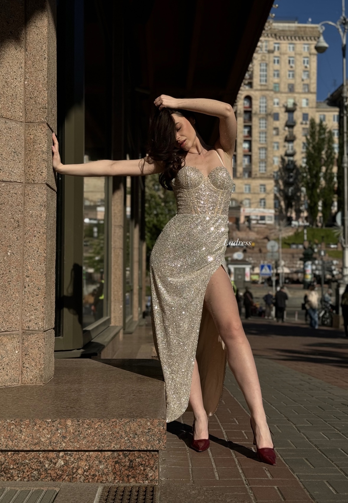 Верх виконаний із корсетної сітки, яка надає фігурі чітких ліній і чудово тримає форму.Зовнішній шар-сітка з блиском ,яка вловлює світло прикожному русі.Спідниця має м’яку підкладку з атласу для максимального комфорту.Позаду шнурівка,яка дозволяє ідеально відрегулювати посадку на талії.Дизайн доповнює витончена зборочка збоку таглибокий розріз, що додає образу жіночності та впевненості.