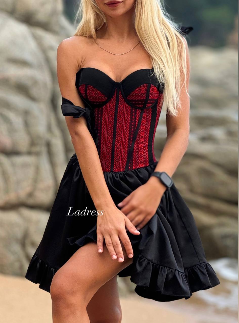 Ця вишукана чорна сукня з елементами червоної української вишивки поєднує в собі класичну елегантність і національні мотиви. Верх сукні має корсетний крій, що ідеально підкреслює талію та створює витончений силует. Спідниця пишна з рюшами додає образу легкості та грайливості, дозволяючи вам почуватися вільно та комфортно. Червона вишивка на чорному тлі створює контраст і символізує силу та енергію українських традицій.